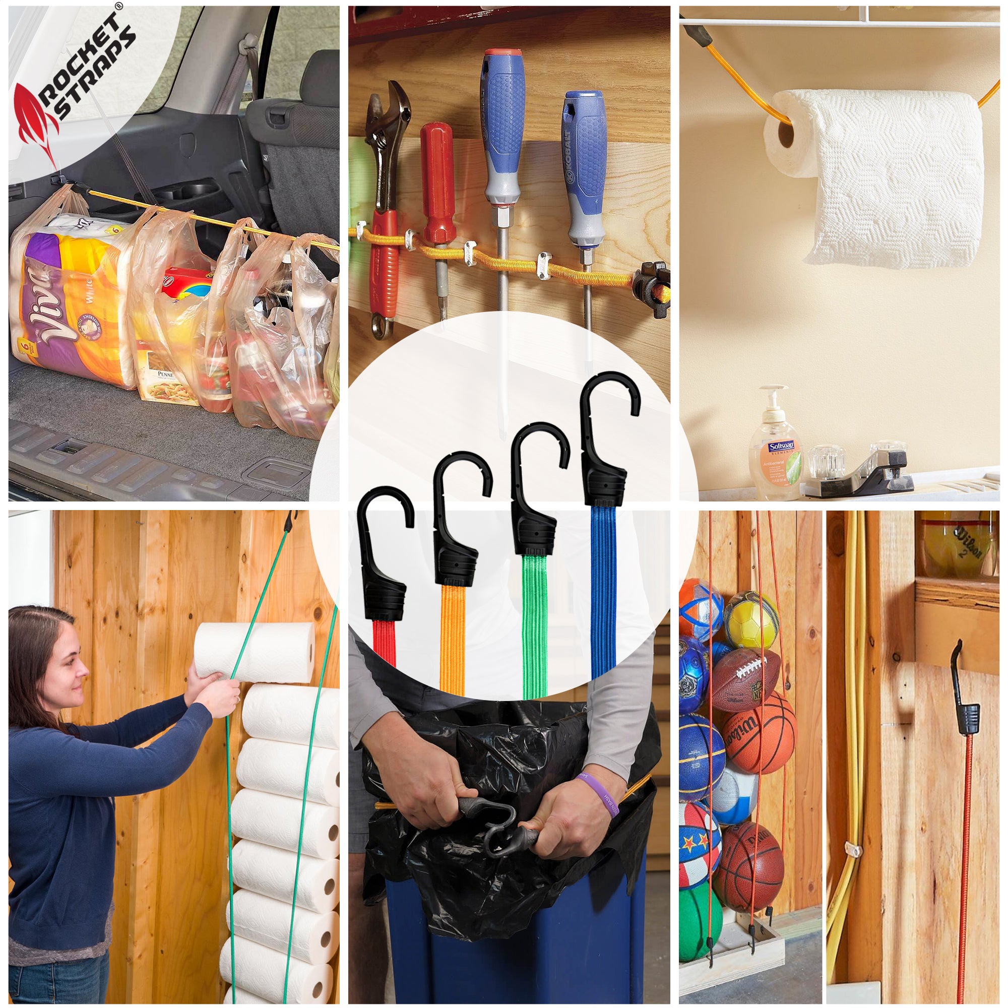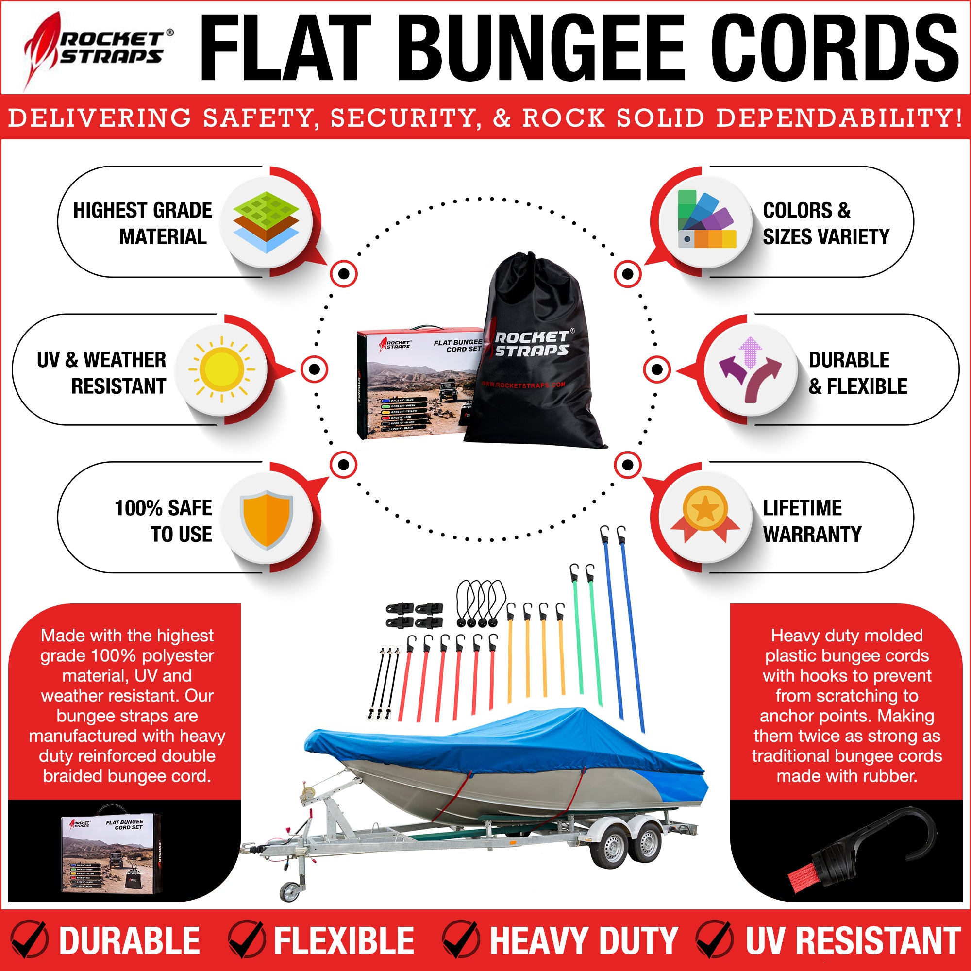 - SUITABLE FOR ALL OCCASIONS AND USES - ROCKET STRAPS bungee cords are made with a 100% latex core, making them extremely heavy duty and reliable for all possible needs. There’s a wide range of uses for your bungees, most common uses and places to store bungee cords are for Camping, Truck Use, Boats, Moving, Lawn Equipment, Tarp Tie Downs, Securing Equipment, and many more.
